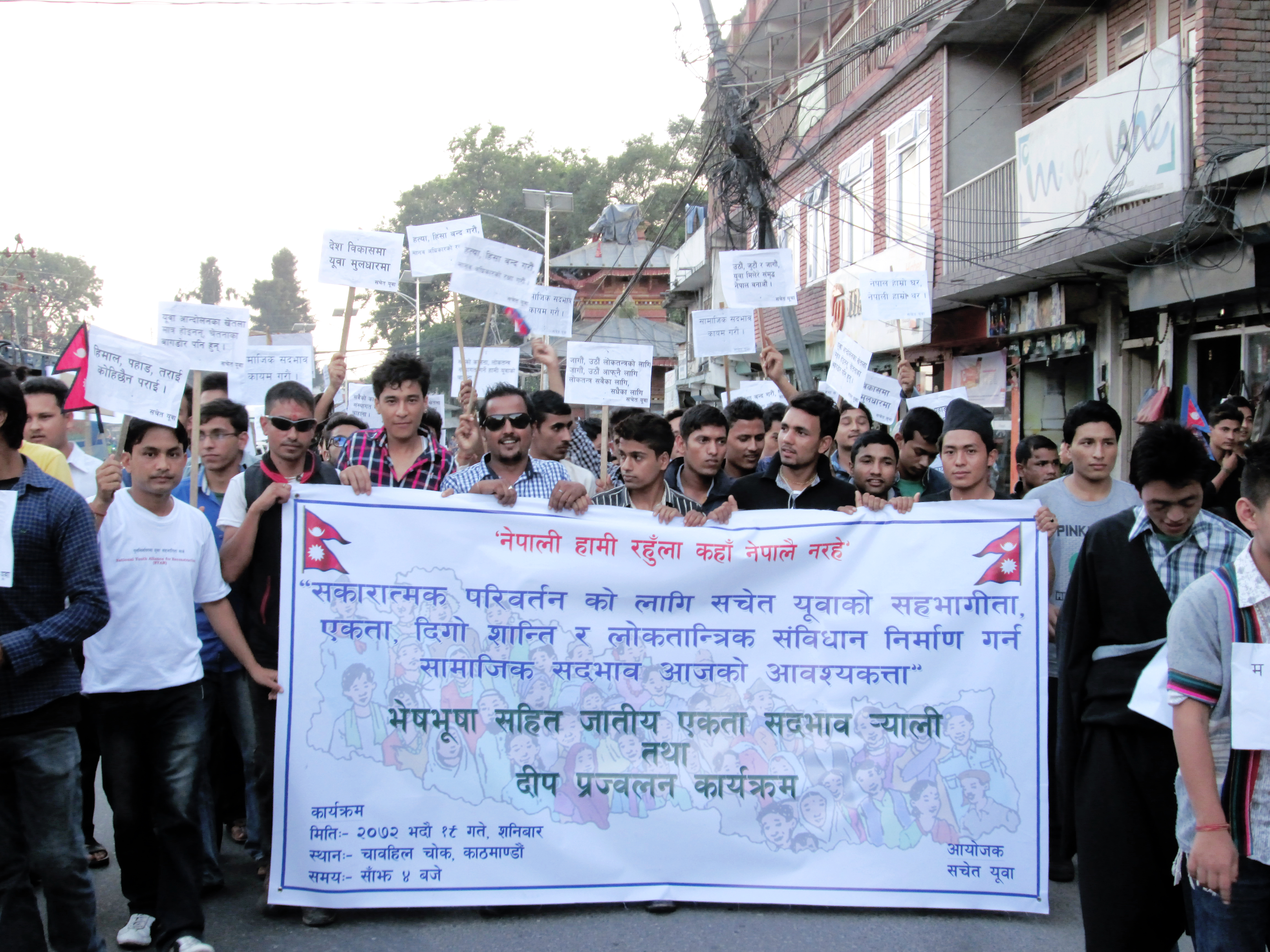 भदौ २० , काठमाडौँ – सामाजिक संजाल प्रयोगकर्ता र अन्य क्षेत्रका क्रियाशील युवाहरुको “सचेत युवा समुह”ले शनिबार साझ काठ्मण्डौको चाबहिलमा जातिय एकता सद्भाब र्यालि तथा दिप प्रज्वलन कार्यक्रम आयोजना सम्पन्न गरेको छ । देशको बिभिन्न भागमा घट्दै गैरहेको जातिय दङा एव कैलालिको टिकापुरमा घटेको अमानबिय घटनाको बिरोधमा कार्यक्रम को आयोजना गरिएको हो ।