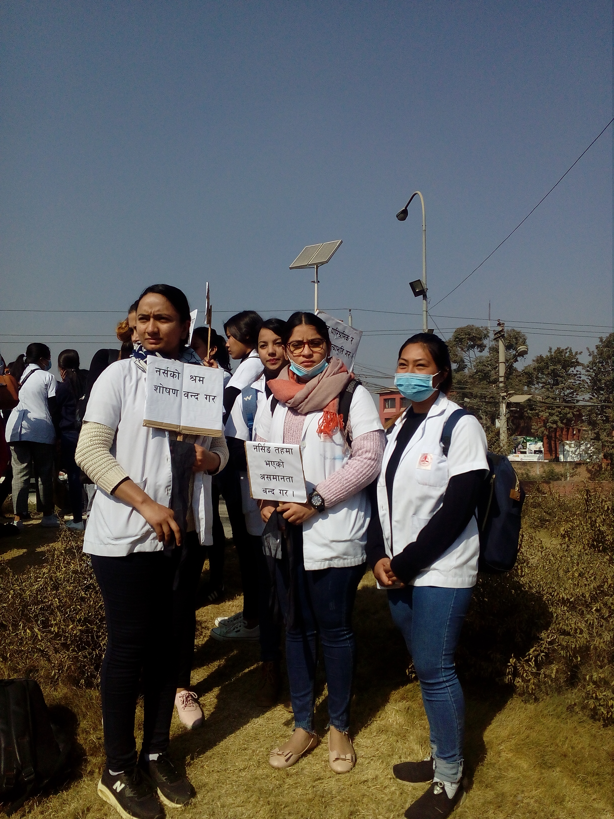 उनीहरुले श्रम ऐन लागु गर,नर्सको श्रम शोषण बन्द गर, शैक्षिक योग्यता अनुसार दरबन्दी सिर्जना गर, नर्सिङ तहमा भएको असमानता बन्द गर, महाशाखा पुनस्र्थापना गरियोस, लगायतका नारा लेखेको प्लेकार्ड बोकेका थिए ।