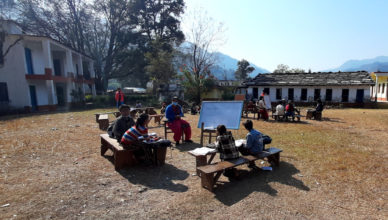 मङ्सिर २४, काठमाडौँ बैतडी–दार्चुलाको सीमा क्षेत्र शैल्यशिखर नगरपालिका–९ मा रहेको गोकुुलेश्वर माविका विद्यार्थीलाई घाममा बसाएर पठनपाठन गराइँदै । पछिल्लो समय चिसो बढ्दै गएको